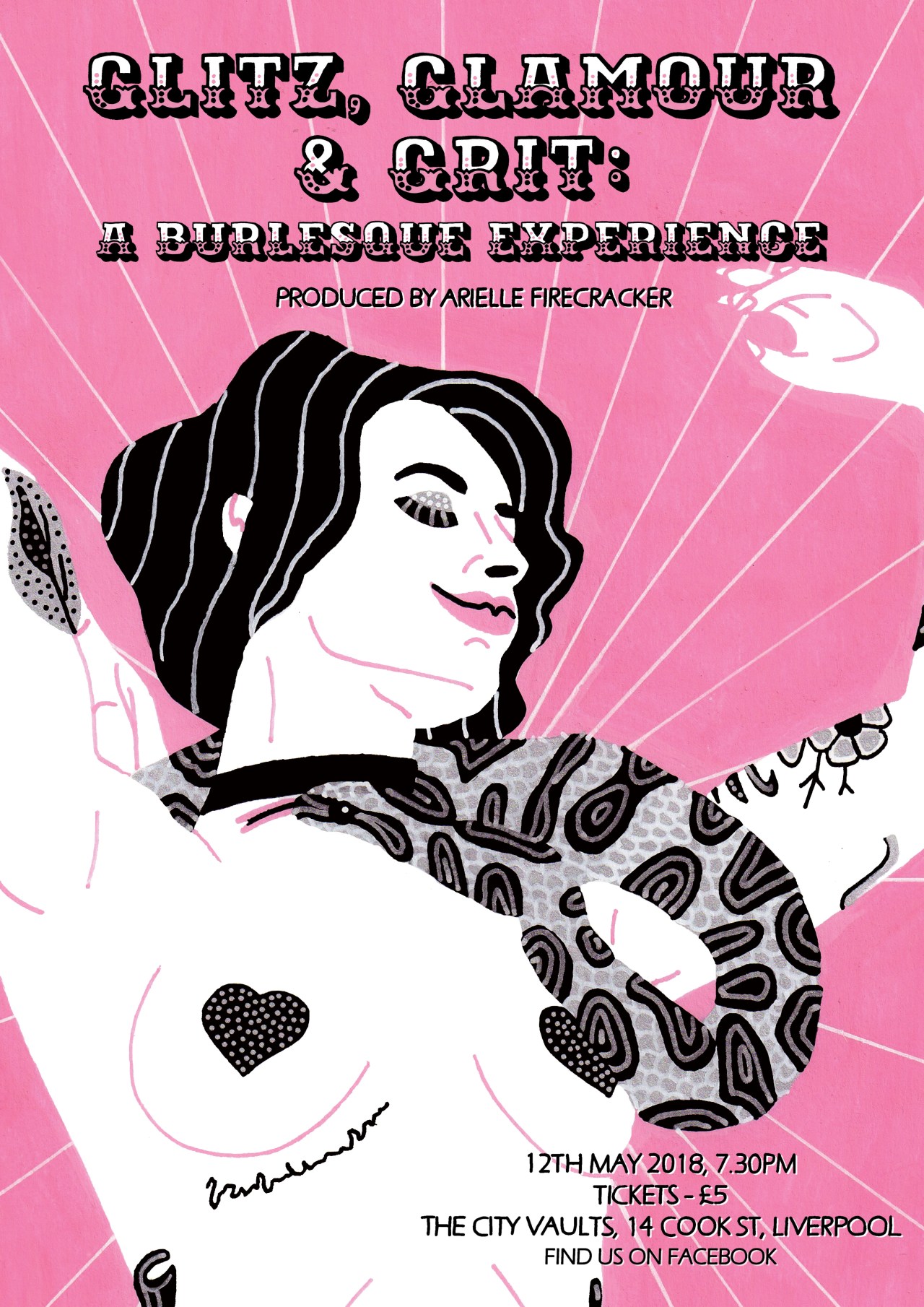 In early 2018, I was commissioned by Liverpool-based burlesque artist Arielle Firecracker to design the poster for her show ‘Glitz, Glamour and Grit’, which was the first show she produced. I was also commissioned to create a poster for the Halloween show.