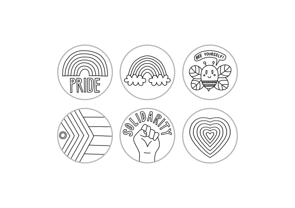 In summer 2022, I was commissioned by Creative Spaces Co. to design badge designs that could be coloured in by the children and young people to came to their stall at Liverpool Pride. You can see the colour-in sheet below.